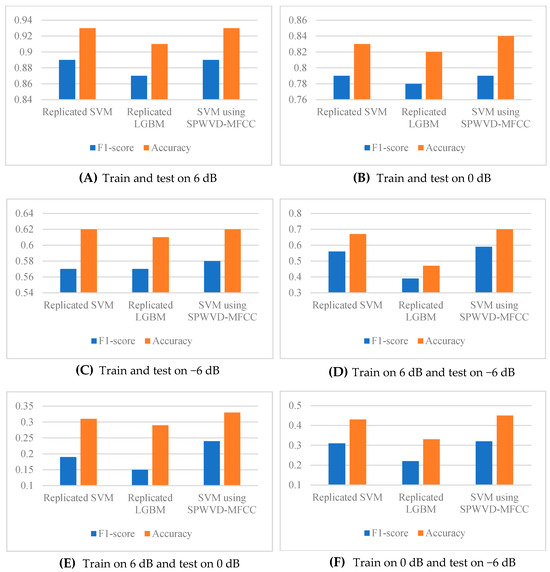First, we compared the classification performance under conditions where training and testing were conducted with the same SNR (Figure 3A–C, representing 6 dB, 0 dB, and −6 dB, respectively). The results indicate that the SVM using SPWVD-MFCCs achieved a comparable classification performance to the reproduced SVM method. Notably, there was a slight improvement of approximately 1% in accuracy at 0 dB and F1-score at −6 dB. This suggests that the SPWVD-MFCC has a comparable ability to express features for industrial machine anomaly detection as traditional MFCC and other STFT-based spectral features and even outperforms them in certain scenarios.