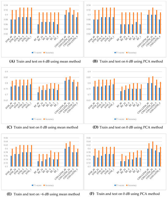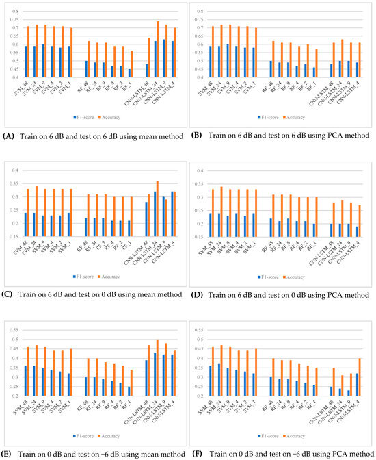 Then, to evaluate the noise robustness of the features, we trained the models on high-SNR datasets (e.g., 6 dB or 0 dB) and tested them on low-SNR datasets (e.g., 0 dB or −6 dB); therefore, analyzing the feature performance in complex environments. As shown in Figure 3D–F:
