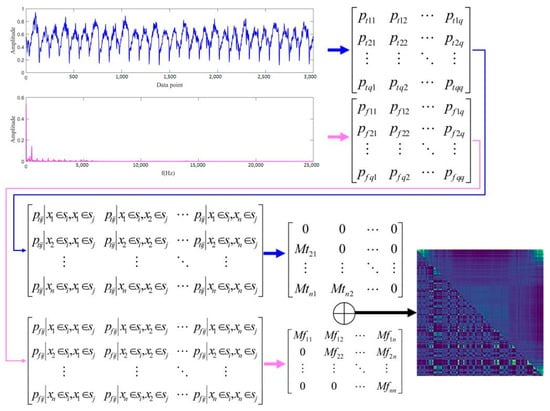 The Markov transition field (MTF) was proposed based on a Markov chain to encode one-dimensional time-series data into two-dimensional images [33,34]. Given a time-series and its corresponding Markov chain with q states , the MTF quantifies the multi-step transition probabilities between pairs of data points within the dataset X during the creation of the two-dimensional data representation. The MTF matrix of X with S is as follows: