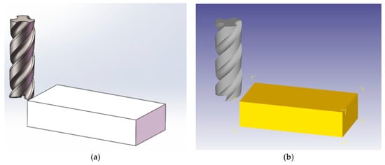 Since Deform is not professional three-dimensional drawing software, in the face of the simulation and analysis of complex structures, they need to be premodeled with the help of professional three-dimensional modeling software and then imported into Deform for analysis. In this paper, SolidWorks is employed to minimize the difference between the 3D model and the actual cutting machining process. The dimensions of the workpiece used in the experimental process are 300, 100, and 80 mm, and the diameter and length of the tool are 10 and 75 mm, respectively. To save computation time and storage space, the dimensions of the workpiece in the simulation do not need to be the same as those in the experiments; the dimensions of the workpiece in the simulation are 40, 20, and 10 mm, and the milling cutter model has the same diameter and length as the actual tool. Figure 2 shows the SolidWorks 3D assembly model before and after importing Deform.