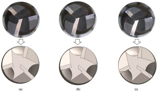 Since tool wear is a process of gradual degradation, simulating it every moment through finite element simulation will greatly increase the time cost of the method. In this paper, the wear length of the lower surface of the tool wear is used as the index, and three different wear states of the tool are constructed for numerical simulation. Figure 4a shows the initial stage of tool wear, Figure 4b shows the stable wear stage of the tool, and Figure 4c shows the severe wear stage.
