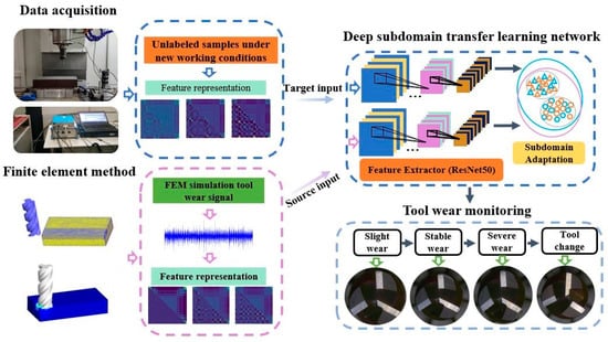 To reduce the experimental costs associated with tool condition monitoring (TCM) under new cutting conditions, a finite element modeling (FEM)-assisted deep subdomain adaptive network (DSAN) approach is proposed. Initially, an FEM technique is employed to construct a cutting tool model for the new cutting condition (target domain), and the similarity between simulated and experimental data is assessed to obtain valid simulated samples for the target domain. Subsequently, the time–frequency Markov representation method is utilized to extract imaging features from the simulated samples, which serve as input features for the monitoring model. Then, a DSAN model is established to facilitate the transfer from simulation to reality, with the source domain comprising a simulated sample set under new cutting conditions that includes various types of tool conditions obtained through FEM, and the target domain containing only a limited number of normal tool condition samples under new cutting conditions. The application analysis has demonstrated the effectiveness of the proposed method, achieving a classification accuracy of 99%. The proposed approach can significantly reduce experimental costs and obtain high-precision diagnostics of tool conditions with a small sample size.