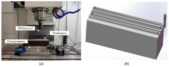 The milling experiment uses a CNC milling machine center as the experimental vehicle. During the cutting process, three-directional cutting force signals are collected simultaneously by a charge amplifier and a data acquisition instrument, and a force measuring instrument (Kistler 9139AA) is installed under the workpiece, as shown in Figure 6a. AISI 1045 steel was employed as the machining workpiece, with dimensions of 300 mm × 100 mm × 80 mm.