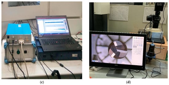 Experimental setup: (a) experimental platform, (b) cutting process, (c) data acquisition instrument, and (d) industrial measuring microscope.
