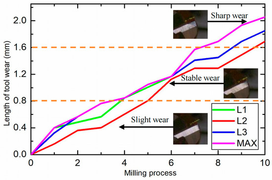 The data acquisition instrument used in this experiment is the MI-70xx series data collector and analyzer provided by Hangzhou Yiheng Technology Co., Ltd. (ECON, Hangzhou, China), as shown in Figure 6c. After the milling cutter completes one cutting task on the workpiece surface, pause the milling operation and position the end milling cutter vertically under the microscope to measure the wear length of each blade (shown in Figure 6d). Take the maximum tool wear value of three blades, VB = Max (VB1, VB2, and VB3), as the current tool wear value. Figure 7 depicts the progression of tool wear, categorized into three groups: slight wear (VB < 0.8 mm), stable wear (0.8 mm ≤ VB ≤ 1.6 mm), and sharp wear (VB > 1.6 mm) [38].