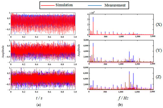 Deform is used to obtain transferable data under the new working conditions to further realize the virtual-to-real transfer. To assess the validity of the simulated data, the simulation data under normal operating conditions of the tool in the target domain was compared with experimental data. Figure 8a displays the time-series diagrams for the three directions (X, Y, and Z) of the sensor, while Figure 8b presents the spectrograms for these directions. It can be found that, in the frequency domain, the simulated data closely matches the experimental data in terms of frequency features, with only minor differences in amplitude.