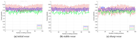 The simulated data of 800 points are compared with the experimental data by means of a data sliding window, whose step size is set to 800, and the values of cosine similarity are recorded once for each sliding window. Figure 9 shows the cosine similarity of simulated data and experimental data in the Z direction, which can be seen to reflect high similarity, thus reflecting the validity of the simulated data.