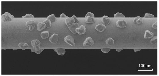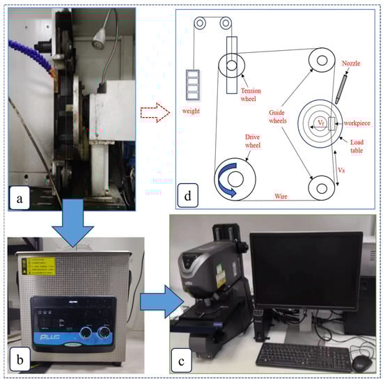 The cutting experiment was conducted on a single-wire diamond wire-cutting machine (SH300, Guangzhou Shenghai Electronic Technology Co., Ltd, Guangzhou, China). The electron microscope image of the diamond wire (Provided by Shantian New Materials Co., Ltd., Linyi, China) used is shown in Figure 1 and the parameters are listed in Table 1. The schematic diagram of the machine setup is shown in Figure 2d. After passing through the tension wheel and guide wheel, the wire is evenly wrapped around the driving wheel and the tension force of the wire is provided by the heavy object pulling the tension wheel. The section of the wire between the guide pulleys is used for cutting. Before the experiment, the workpiece was fixed on the load table with AB glue, and the cutting position was adjusted by controlling the movement and rotation of the load table. The cutting thickness was set to 1 mm. At the beginning of cutting, the machine motor drove the load table to move in the direction perpendicular to the wire movement at a constant feed speed of Vf, while the wire reciprocated at a speed of Vs for cutting processing. Tap water was chosen as the cutting fluid, which plays a role in lubrication, cooling, and chip removal.