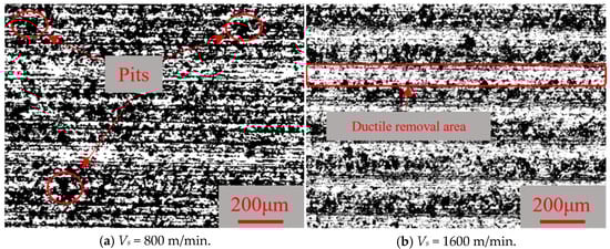 Figure 3 shows the 2D sawed surface morphology at a wire speed of Vs = 1200 m/min and a workpiece size of s = 30 mm, with feed speeds of 0.1 mm/min (A1B3C3) and 1.3 mm/min (A5B3C3), respectively. The white areas represent the ductile removal regions, and the black areas represent the brittle removal regions. Material removal during diamond wire saw cutting is realized by diamond abrasives fixed on the wire surface pressing into and scratching the workpiece surface with the movement of the wire. The material removal process, however, is a combination of ductile removal and brittle fracture, which is largely dependent on the processing conditions. Considering the differences in the form and dimensions of the diamond abrasives on the wire, as well as the different protrusion heights of the abrasives, the stress conditions at the contact points between the abrasives and the workpiece also varied, leading to randomness in the material removal mode. This is reflected in the figure, where the sawed surface showed the combined effects of brittle and ductile removal. As shown in Figure 3, at a feed speed of 0.1 mm/min, the white area occupied a larger proportion, with ductile removal being the dominant material removal mode. When the feed speed increases to 1.3 mm/min, the proportion of black brittle removal areas significantly increased, and the form and dimensions of brittle pits also increased, resulting in a decline in surface quality.