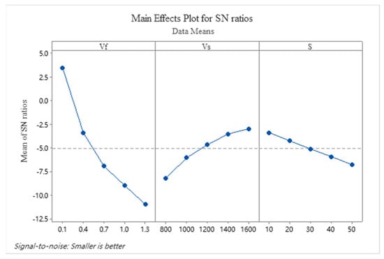 It is necessary to further analyze the effects of various process parameters on SR. The signal-to-noise ratio (S/N) is a key metric for assessing data variation and is widely used in the analysis of surface quality during processing [,]. Depending on the experimental objectives, the signal-to-noise ratio is usually divided into three types: the smaller the better, the larger the better, and the nominal the best state. Since the surface quality evaluation index used in this study is Ra value, and a smaller Ra value indicates better surface quality, the “smaller the better” type of S/N evaluation indicator was selected. The experimental result data were converted into signal-to-noise ratios according to Equation (1), with a larger signal-to-noise ratio corresponding to a smaller Ra.