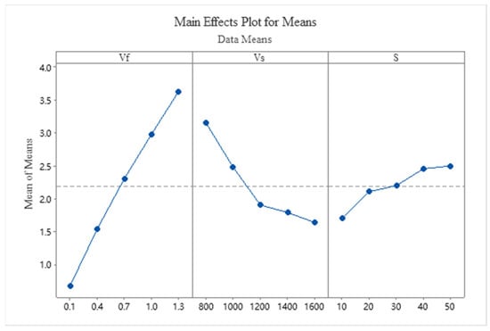 The results of the orthogonal experiment were analyzed using Minitab Statistical Software version 2020 (Minitab, State College, PA, USA). Figure 6 shows the signal-to-noise ratios of Ra for the three factors at different levels. It can be seen from the figure that all three factors have some influence on SR. Among them, the variation in Ra signal-to-noise ratio caused by changes in feed speed is significantly greater than that of the other two factors, indicating that feed speed is the most influential factor on SR. The variation in Ra signal-to-noise ratio caused by changes in workpiece size is the smallest, making it the least influential factor on SR. Additionally, as feed speed and workpiece size increase, the S/N value gradually decreases, indicating an inverse relationship between these two variables and the signal-to-noise ratio. In contrast, as wire speed increases, the S/N value gradually rises, showing a direct relationship between the two. Since the “the smaller the better” type of S/N was used, a larger S/N value indicates a smaller Ra value. Therefore, based on the S/N, it can be determined that both feed speed and workpiece size are directly proportional to SR, while wire speed is inversely proportional to SR. Figure 7 shows the main effects plot of the mean Ra for the three factors at different levels. It can be clearly seen from Figure 7 that the Ra value gradually increases with the increase in feed speed and workpiece size, while it gradually decreases with the increase in wire speed.