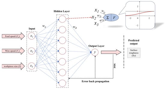 Theoretical modeling often involves making idealized assumptions about certain factors that are difficult to account for during the design process, which can impact the accuracy of the final predictions. Compared to theoretical modeling of SR based on machining mechanisms and tool morphology simulation, experimental research offers more direct empirical evidence, which can better guide practical applications and solve practical problems. Therefore, researchers have focused on establishing reliable input–output Ra prediction models based on actual machining experimental data. As a statistical tool, regression analysis is widely used to estimate the relationships between the parameters that affect the machining process. Upadhyay et al. [] developed a multivariate regression model for predicting the turning SR of Ti-6Al-4V alloys based on experimental parameters and good prediction accuracy (maximum percentage error: 7.45%) was achieved. Ozturk et al. [] obtained a regression prediction model for the SR of sawn wafers with better accuracy and optimal experimental parameters by comparing different linear and nonlinear regression models. However, due to the variation in the functions chosen when using regression models, the predicted results differ significantly, leading to considerable discrepancies in accuracy. Consequently, artificial neural network (ANN) prediction methods based on software calculations have gained popularity in recent years. The back propagation (BP) neural network is a multilayer feedforward neural network trained by an error back propagation algorithm. It has been widely used in signal processing, time series prediction, and other fields because of its powerful nonlinear modeling capability, high flexibility, and adaptive ability. Therefore, scholars have studied the Ra prediction model based on the BP neural network. Kayabasi et al. [] established a model based on the BP neural network to model the relationship between input parameters (wire speed, feed speed, and oil ratio in the coolant) and output values (Ra) in DWS cutting of silicon ingots and explored the law of the influence of single-parameter variations on Ra through the model. Aiyar et al. [] used a back propagation artificial neural network model to predict the Ra of the EDM wire-cutting process and the results show that the overall regression value R obtained is 0.94, which indicates that the model has high prediction accuracy. Paturi et al. [] modeled and predicted the SR Ra of Inconel 718 alloy EDM wire-cut machining using a BP neural network model and the results showed that the prediction model has a small prediction error.
