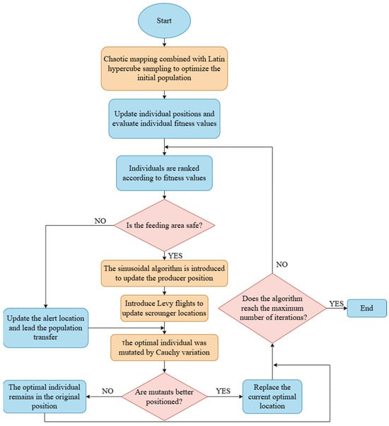 BP neural networks have strong nonlinear modeling capabilities, but traditional BP neural networks have weak generalization ability and are easily affected by local optima points during the optimization process. Therefore, neural networks often need to be combined with certain algorithms for optimization. The SSA, a heuristic optimization algorithm based on the behavior of sparrow populations, was proposed by Xue et al. [] in 2020 and has been extensively used for optimizing neural networks. The algorithm can efficiently search the solution space to find the global optimal solution or near-optimal solution by simulating the social behavior of sparrows. Although the SSA is designed to avoid getting trapped in local optima, the SSA may still risk premature convergence to non-global optimal solutions in practice, and needs to be used in combination with other techniques or algorithms to improve the ability of solving problems. Therefore, this paper proposes a mixed-strategy improved SSA called ISSA to address this issue. The flowchart of ISSA is shown in Figure 9, and the specific improvement steps are as follows: