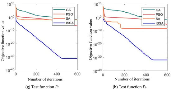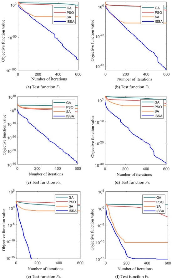 It can be seen from Figure 10 that, whether for unimodal or multimodal functions, the optimization effect of the ISSA is superior to GA, SA, and PSO. ISSA consistently achieved good fitness values at the start and showed faster convergence speed. With the same number of iterations, the solution accuracy of ISSA was also notably higher than that of the other algorithms, demonstrating the superiority of the ISSA.