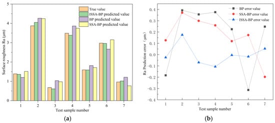 (a) The predicted Ra was compared with the true value using ISSA-BP, SSA-BP, and conventional BP neural networks on the prediction set; (b) Ra prediction error values of the three algorithms.