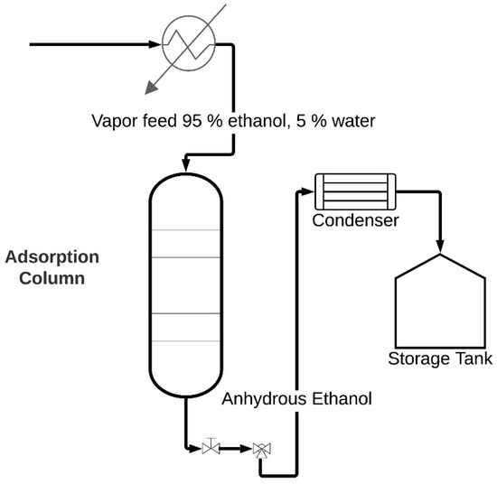 In recent years, global biofuel production, including ethanol, has experienced a significant increase, with the United States, Brazil, and China emerging as major producers. This growth stems from global energy reforms aimed at reducing greenhouse gas emissions in the medium and long term [1,2]. Ethanol, a highly sought-after raw material, distinguishes itself for its involvement in a diverse range of products, including solvents, refrigerants, preservatives, antiseptics, perfumes, alcoholic beverages, and fuels [3,4,5]. Fuel ethanol, a concentrated alcohol used as an additive to gasoline, undergoes purification processes to eliminate residual water from prior production stages. While distillation is the most common technology, followed by extractive distillation, dehydration by molecular sieves offers a more energy-efficient pathway [6]. However, areas for improvement and further development in this process still exist.