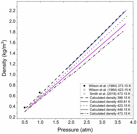 In Figure 3, approximate results are observed compared to those presented in the literature for specific temperature and pressure conditions. The figure represents extrapolated density for vapor water under the pressure and temperature conditions reported by Wilson et al. [41] for superheated water vapor and experimental data evaluated by Smith et al. [42]. A noticeable agreement becomes apparent when the numerical results obtained with the Fortran program are graphically compared to the literature datasets, highlighting the validity and precision of the methodology employed and substantiating the program’s capability to effectively capture the thermodynamic behavior of water vapor density under superheating conditions.