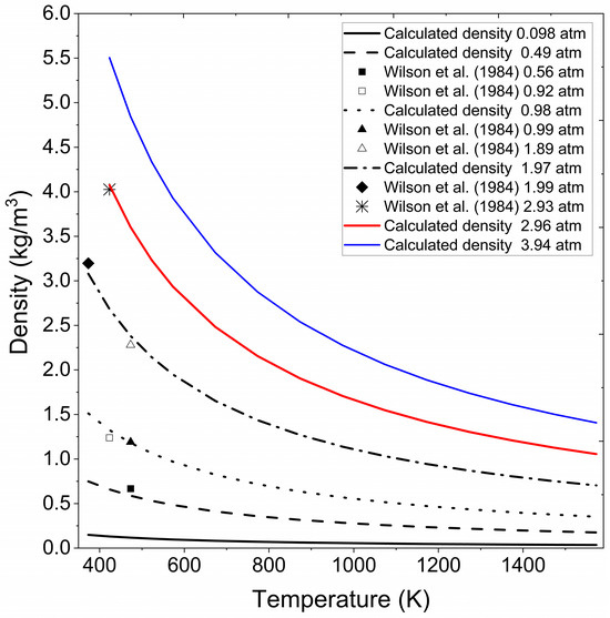 Calculated ethanol vapor density at different pressures and temperatures. Wilson et al. (1984) [41].