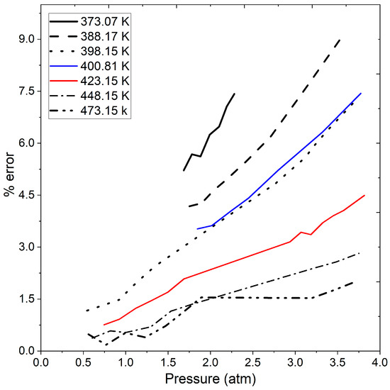 Figure 7 shows the percentage error from the calculated data using the ideal gas law concerning the experimental data in Table 5, Table 6 and Table 7 as well as Figure 6. The figure reveals that the error increases with rising operating pressure. While the error may not be a significant factor when handling vacuum or atmospheric pressure, it becomes noteworthy when exceeding 1.5 atmospheres. Specifically, at pressures greater than 2 atmospheres, the calculated error exceeds 3%, and at a temperature of 373.07 K and pressures surpassing 1.5 atm the error surpasses 4.5%. Between temperature range of 373.07 and 400.81 K, and pressures ranging from 0.5 to 3.5 atmospheres, the calculated error reaches 9% as the operating pressure increases. This observation is crucial, especially considering the operating pressures involved in pressure swing adsorption processes for ethanol dehydration reported in previous studies [7,13,14,37]. At low pressures, the density calculated by the ideal gas law may not significantly affect the PSA model. However, at moderate pressure, it becomes a crucial factor to consider. Therefore, the inclusion of a more rigorous state equation, such as the Peng–Robinson equation, in the calculation of the water–ethanol vapor mixture density would complement studies of ethanol dehydration process. Until this point, the presented results encompass stages 1 and 2 of Section 2.4: Solution Methodology.