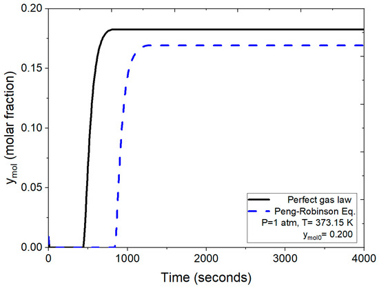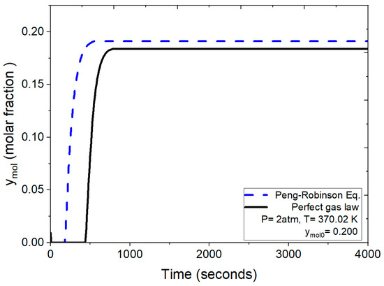 The breakthrough curves depicted in Figure 10 compare the results obtained under identical operating conditions (2 atm, 370.02 K and ymol0 = 0.200 for water concentration) using both the numerical solution incorporating the ideal gas law and the one employing the Peng–Robinson equation for the density calculation. Under these conditions, as per the ideal gas law, the process leading to bed saturation initiates saturation around 200 s, culminating complete saturation at 435 s. In contrast, applying the more rigorous Peng–Robinson equation initiates saturation at approximately 490 s.