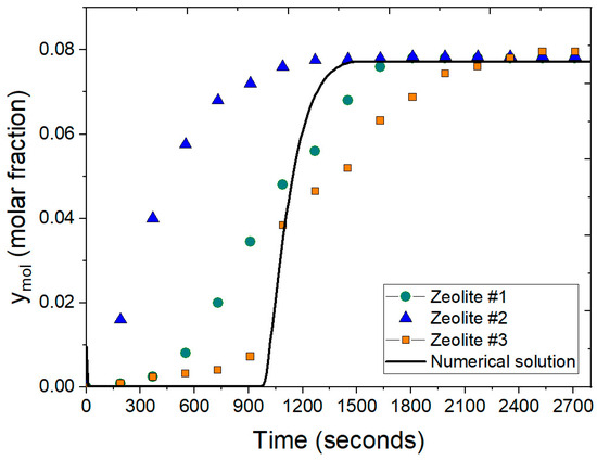 In this scenario, water presented in the binary mixture is effectively retained, ridding the mixture of water for about 900 s. Subsequently, as the molar fraction of water starts to increase, the feed water concentration is eventually reached at the process output; that is, there is no water retention after saturation is reached. This observed behavior closely aligns with experimental breakthrough curves reported by Leo-Avelino et al. [46] where similar conditions regarding particle size and the adsorbent agent (zeolite clinoptilolite) were employed. Both studies show a consistent adsorption process, with the packed bed reaching saturation at 900 s. It is noteworthy that the numerical solution presented here is based on implementing the Peng–Robinson equation. Comparatively, breakthrough curves reported by Kupiec et al. [7], Rossi et al. [14], and Gutierrez-Gonzalez et al. [40] were derived using a mathematical model with the ideal gas law for binary mixture density at atmospheric pressure conditions. The results obtained for natural zeolite clinoptilolite exhibit similarities to those presented for artificial zeolites in the works of Kupiec et al. [7] and Kupiec et al. [4].