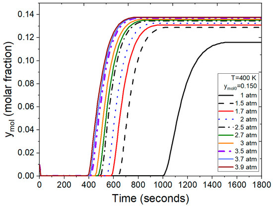 The test illustrated in Figure 13 was conducted under various operating conditions, specifically with a feed mol fraction of ymol0 = 0.200, representing the water concentration in the binary mixture. Under these conditions, the program calculates that the process reaches bed saturation between 250 and 500 s for pressure ranging from 1.5 to 3.9 atm. The breakthrough curve at atmospheric pressure reaches saturation in 1100 s, extending the time required for the adsorption process to conclude. The behavior observed in Figure 13 aligns with what has been reported in previous studies [7,14,37,46]. Additionally, the time intervals are consistent with those reported in the work by Karmi et al. [13].