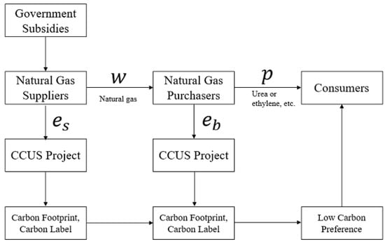 In summary, although there have been more studies in the existing literature on natural gas supply chain optimization, game theory application and government subsidy policy, most of the studies failed to comprehensively consider the multiple impacts of government subsidies, CCUS technology abatement, carbon dioxide utilization, and consumer preferences. By constructing a Stackelberg game model, this study systematically analyzes the impacts of government carbon emission reduction investment cost subsidies and natural gas cost subsidies on supply chain members’ decision-making, especially in the case of considering consumers’ low-carbon preferences, which fills the gap in existing studies in terms of the comprehensive analysis of multiple factors. In addition, although the study by Che et al. [20] deals with the pricing mechanisms of natural gas supply chains with the goal of “dual carbon”, it has not yet addressed the impacts of different subsidy mechanisms on the emission reduction of CCUS technologies. In this study, the optimal strategies of natural gas suppliers and buyers in the natural gas supply chain under different subsidy mechanisms are investigated through the use of game theory and optimization models to provide empirical evidence and theoretical guidance for policy makers and industry practice.