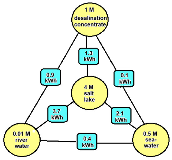 - River water + desalination concentrate: Desalination plants are placed in dry areas where there are usually no rivers. However, municipal wastewater from the neighboring city, which also has a low salt content, may be available to generate SGE in combination with desalination concentrate [6].