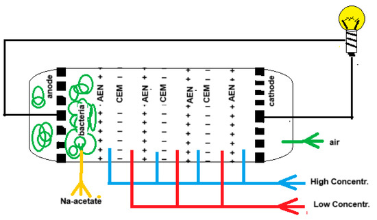 “Blue energy meets green energy in microbial reverse electrodialysis cells” is the beginning of the title of a recent review by Pandit et al. [25]. The combination of both techniques in a single device was launched by Younggy Kim and Bruce Logan in 2011 and is known as the “microbial reverse electrodialysis cell” (MRC) [26]. Figure 3 shows the principle of an MRC. The electrode compartments of a classic RED stack are modified as follows: air is injected into the cathode compartment while the anode is loaded with exoelectrogenic bacteria. The RED part is fed with salt and fresh water while the anode space is rinsed with an acetate solution that is a model for urban wastewater.