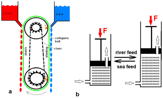 Five years before Loeb’s PRO patent, Sussman and Katchalsky published a paper titled “Mechanochemical Turbine, A new power cycle” [38]. The authors constructed a working SGE machine based on the shrinking of a crosslinked collagen cord in salt water; it returned to its original length in fresh water. Figure 5a shows a simplified model of their generator. In 2014, Zhu et al. published a paper describing their experiments with a hydrogel in a cylinder that could push a piston away as it swelled upon contact with fresh water and shrank again upon the introduction of salt water (Figure 5b) [39].