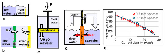 In 1979, Olsson et al. published a paper entitled Salinity Gradient Power: Utilizing Vapor Pressure Differences [40]. The method—known as VPDU—is based on the difference in the vapor pressure of fresh and salt water. Water vapor will find its way from the fresh water to the salt water (Figure 6d). The researchers tested this principle in a vacuum chamber in which a turbine was placed in the vapor stream. The heat of condensation in the salt water was returned to the fresh water via a heat exchanger, largely compensating for the significant heat of evaporation. The method has not been followed-up to date.