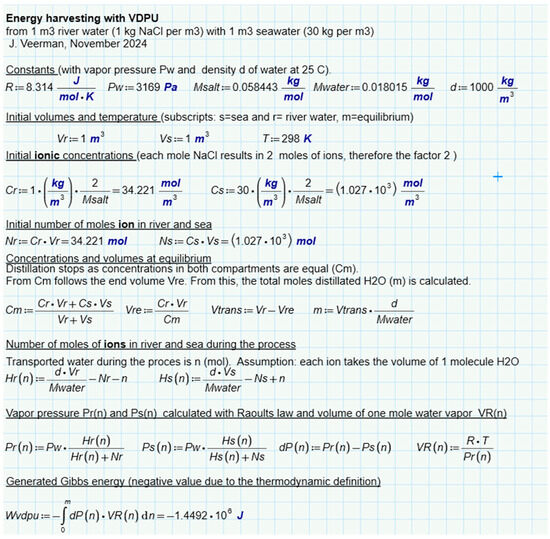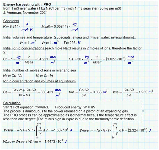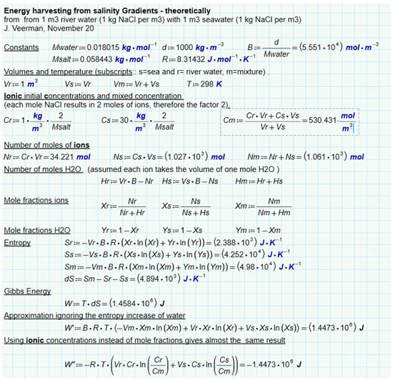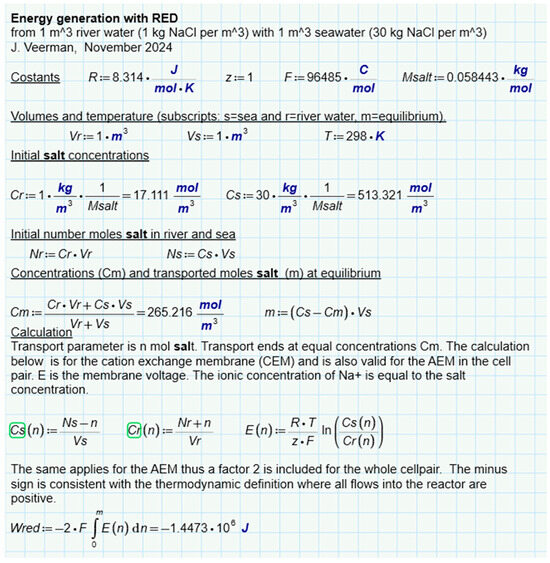 The calculation is presented in Figure 7. It follows that 1.4485 MJ is available due to the increase in entropy from ions and water. If only water is considered, this amount is a little less (1.4473 MJ). In this approach, the ideality of the solutions is assumed. Post et al. corrected these values for the nonideal behavior of the solutions and found that 88% of the ideal value is available in reality [41]. The same authors also performed batch processes with RED with two types of spacers (0.2 mm and 0.5 mm). In these experiments, most of the calculated energy was harvested, especially at low current densities where reversibility is best approximated. Figure 6e shows the results and from the regression lines, a recovery at extreme low current density is expected at about 85% of the available energy.