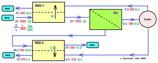 Almost ten years after the RO patent, Loeb came up with another patent—this time, a method to reverse the RO process [36]. In this way, energy can be generated by the reversible mixing of fresh and salt water. Loeb called the technique “Pressure retarded osmosis” (PRO). Almost simultaneous with Loeb’s patent, Norman published a hypothetical machine for generating energy by osmosis [37]. From this time on, PRO took flight in a way that was more or less parallel to the developments of RED. Nowadays, PRO, together with RED, are the most studied methods for SGE production. On Google Scholar “reverse electrodialysis” yields 8970 hits and “pressure retarded osmosis” 8860 hits (October 2024). The principle of PRO is shown in Figure 4. The input of salt water to the high-pressure system requires little energy because in the pressure exchanger, each liter of input is energetically compensated by each liter of output. Actually, a better name for this apparatus would be “volume exchanger”.