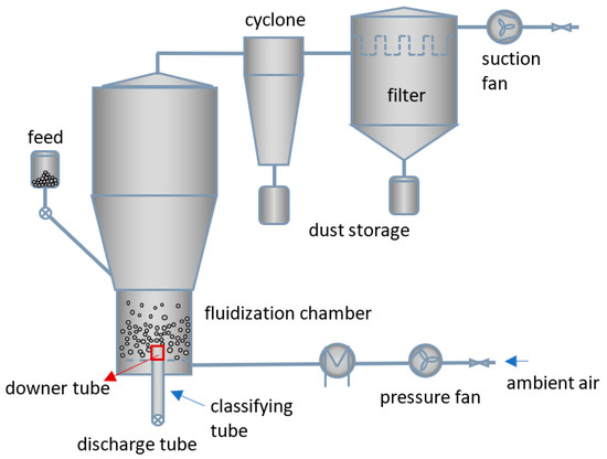 Particles are fed from the top of the fluidized bed, and material discharge occurs from the bed’s base through a central classifying tube (inner diameter: 44 mm; length: 720 mm) with its upper end flush with the upper end of the air distributor plate. This tube is denoted as the classifying tube because it can be operated with classifying air, though this option was not used in the present work. Additionally, a downer tube is installed above the gas distributor plate right on the classifying tube, as shown in Figure 2. For this study, downer tubes with two heights, 70 mm and 110 mm, were used. Both tubes had an inner diameter of 20 mm. Parameters such as temperature of the bed and gas mass flow rate were measured and recorded by a process control system (PCS, Siemens AG, München, Germany, model: WinCC).