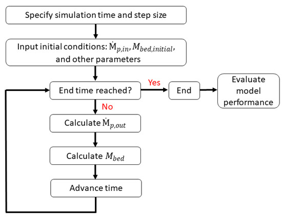 In this setup, p , i n is considered constant, as the feed flow rate remains steady throughout the process. In contrast, p , o u t is evaluated based on algebraic equations that account for the conditions within the fluidized bed. It should be noted that Equation (3) is the differential form of Equation (2).