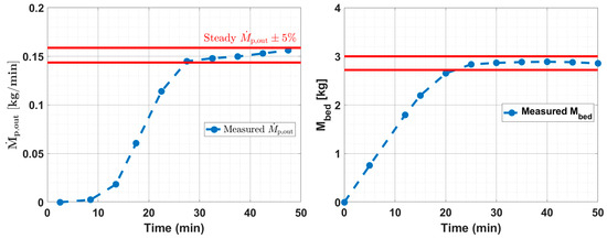 Bypassing the fluidized bed, i.e., connecting the twin screw feeder directly to the sample weighing box ensured that p , i n could be determined in the same way as p , o u t . With both those quantities known in the course of time t , M b e d ( t ) could be obtained from the following equation: