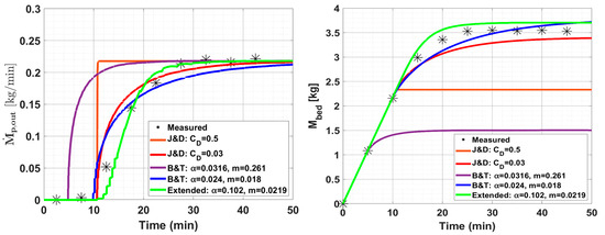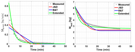 In contrast, the extended equation performed considerably better in capturing the behavior of the semi-batch process. Figure 8 shows that the extended equation closely followed the initial rapid decline in p , o u t and then accurately tracked the gradual reduction over time, resulting in a high R2 value of 0.900 for p , o u t . For M b e d , the extended equation also showed a marked improvement over the other two equations, providing a closer fit to the measured values. It captured the rapid decrease in M b e d during the initial period and reflected the slower decline as the process progressed, yielding an R2 value of 0.900. This performance, significantly higher than that of the J&D and B&T equations, is due to the exponential term in the extended equation, which enables it to better capture the rapid changes observed in the semi-batch process.