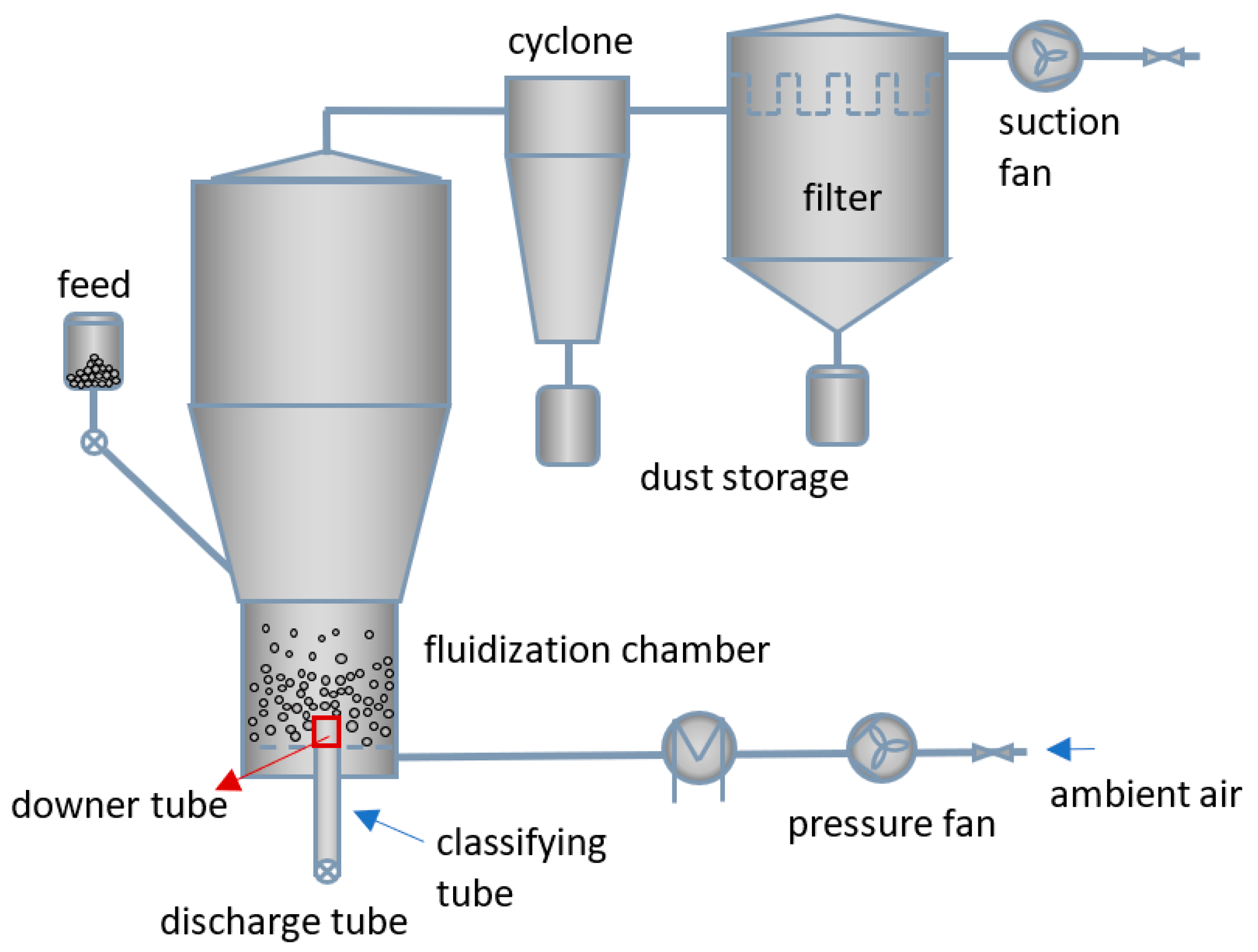 Fluidized bed technology is widely used across various industrial sectors such as the chemical, pharmaceutical, and food industries [1]. It operates by suspending solid particles in an upward flow of gas or liquid, allowing the particles to exhibit fluid-like behavior [2]. Fluidization creates a dynamic environment in which particles are constantly moving, colliding, and interacting with each other and the fluid, influenced by factors such as particle size, shape, density, and the velocity of the fluidizing medium. Fluidized bed technology is used in coating processes [3], granulation [4], and agglomeration processes [5]. Its advantages include enhanced mass transfer, uniform temperature distribution, and improved process efficiency, making it a critical component in achieving high product quality across various sectors [6,7].
