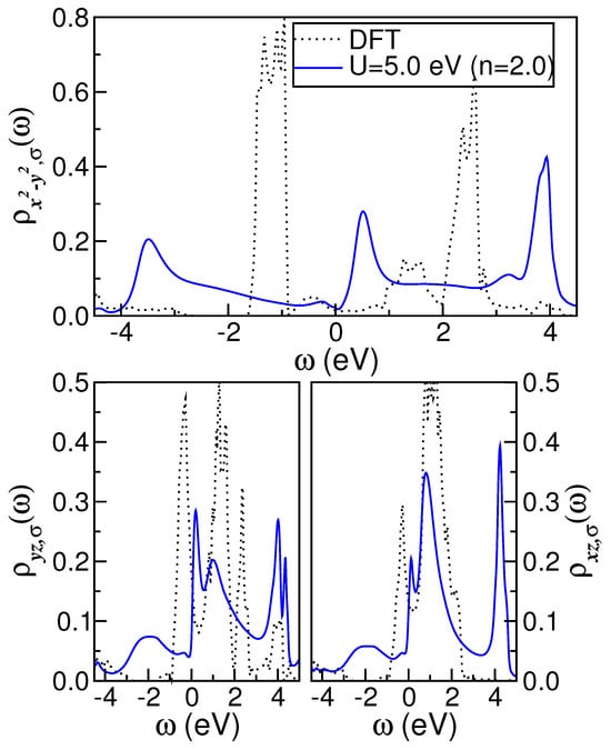Here, we demonstrate that the pseudogap observed in monoclinic [8,29,41,45] is intrinsic and indicative of its proximity to orbital-selective Mottness. To investigate this further, we utilize the DFT- results for the monoclinic structure (space group ) of that were previously computed in Ref. [27] using lattice parameters reported in Ref. [64]. The band-structure calculations in Ref. [27] were performed within the local density approximation (LDA), using the non-fully relativistic PY-LMTO code [69]. In Ref. [27], self-consistency was obtained by performing calculations on a k-mesh, and the radii of the atoms were chosen as (O) and (Mo) a.u. As illustrated in Figure 1, the DFT density of states (DOS) projected on atomic orbitals reveals that the most relevant states in this distorted rutile compound are the Mo- carriers. This observation is consistent with previous studies that identified all orbitals as having appreciable spectral weight close to the Fermi level (). As with and , due to lattice dimerization resulting from Peierls-like structural effects [21] that promote c-axis dimer pairing [70,71], the orbital splits into bonding/antibonding bands, as shown in Figure 1. However, in contrast to the DFT results derived for monoclinic and [22,43,44], the and orbitals of distorted are metallic, with a non-zero DOS near . As seen in Figure 1, the and DOS of monoclinic exhibit a two-peak structure above and below , albeit with a lesser degree of prominence as compared to that observed in the orbital. The reconstruction of the orbitals with nearly Peierls-localized () and itinerant () spectral functions induced by local dynamical correlations in concert with changes in total electron band filling is crucial for understanding the emergent electronic state of pure and electron-doped . This is the focus of the following discussion.