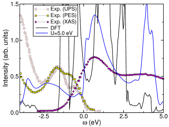 Figure 1 and Figure 2 illustrate the orbital-resolved and total DFT+DMFT results, respectively, computed using eV (and eV) in Ref. [27]. The DFT+DMFT results in these figures demonstrate the significant impact of MO interactions in on the () valence state. Similarly to and [22,25], as well as to - [26], considering , and results in a redistribution of spectral weight over large energies, as visible in Figure 1 and Figure 2. Importantly, the DFT+DMFT result in Figure 2 is in accordance with UPS and PES data presented in Refs. [29] and [41], respectively, which exhibit two principal shoulder features below 1.0 eV binding energy and a pseudogap-like electronic state with a markedly reduced DOS in proximity to in the experimental context. Furthermore, existing PES and angle-resolved PES (ARPES) measurements can be interpreted, to some extent, based on our DFT+DMFT results. An ARPES study [30] reveals a broad maximum centered at approximately 0.2 eV binding energy, which shifts towards as the emission angle and photon energy increase. In light of these observations, we propose that this primary maximum can be identified by the small bump observed in the total DFT+DMFT DOS at eV. As demonstrated in Ref. [27], decreasing the value of U results in the emergence of a significant peak near , which is not observed in experimental data [8,29,41,45]. There is a notable qualitative alignment between our results and the UPS spectra presented in Ref. [29]. Similar to PES, the UPS data at low energies indicate the suppression of FL coherence [8], giving rise to unconventional metallicity in the stoichiometric system. Furthermore, the valence-band spectra obtained from thin films indicate the presence of an energy band with a peak at approximately eV [46], which is consistent with the lower Hubbard band (LHB) centered at energies near to eV, as in Figure 2. Interestingly, this value coincides with a band gap in DFT at which the oxygen p bands begin. The absence of this -band gap in experiments [7,8,45,46,47] may be regarded as an additional fingerprint of hidden dynamical interactions in monoclinic . Finally, to illustrate the influence of many-particle interactions on the system, in Figure 2, we present a comparison between our DFT+DMFT result and the X-ray absorption spectral (XAS) data from Ref. [41]. Although, our result for eV is not perfect, it is nevertheless a valuable contribution to understand the correlated electronic state of the parent compound. The calculated spectra at eV qualitatively reproduce the shoulder feature observed at approximately 0.7 eV above , providing further support for our electronic reconstruction for the bulk crystal shown in Figure 1.