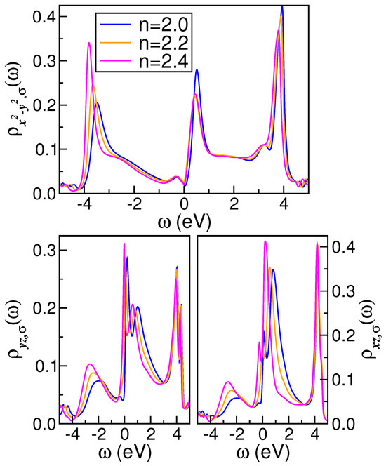 As shown in Figure 3, at eV, a narrow LHB emerges in the orbital, situated close to −3.5 eV, which is dynamically transferred to higher binding energies, becoming slightly more pronounced with increasing total electron filling (n). In contrast to the orbitals, the upper Hubbard band (UHB) is not fully resolved in the orbital sector. Indeed, a sharp antibonding-like peak is observed near to 3.8 eV above , accompanied by a shoulder trace at approximately eV, both exhibiting weak reconstruction with increasing n. Additionally, local correlations between electrons induce a notable dynamical spectral weight transfer in the and orbitals, as seen in Figure 3. Local MO electronic interactions in these orbitals result in the emergence of sharp quasiparticle peaks in close proximity to . These collective many-particle resonances shift towards energies closer to as the number of electrons (n) increases, accompanied by a transfer of spectral weight from the conduction band to the LHBs below 2.0 eV binding energies in the and orbitals. Furthermore, the and orbital proximity effect, which is influenced by sizable and , gives rise to the emergence of UHBs at energies that are in proximity to the renormalized antibonding band in the channels. This phenomenon may explain why, apart from thin films [10], no structural transition has been reported for the compound [29]. It is also noteworthy that incoherent electronic excitations in the valence band induce local moments and, potentially, magnetism [7] related to the development of an LHB [74] with an orbital character in Mo-containing compounds. However, the complex interplay between Fermi surface topology [75] with superconductivity and magnetism [7] in unconventional metals [6,53] is beyond the scope of our present study and is, thus, left for futures studies.