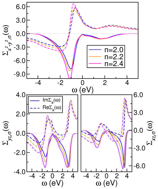 To microscopically elucidate the normal state of pure and electron-doped , in Figure 4, we present evolution of orbital-resolved self-energies (both the real and imaginary parts) associated with the active MO orbitals of monoclinic . A comparison of our results with those of ThFeAsN superconductor [76] reveals the presence of analogous features despite the dissimilar crystal structure, Coulomb interaction parameters, and total band filling in the two systems. This includes a discernible particle–hole asymmetry in Im and an observable orbital selectivity with increasing n. Furthermore, the particle–hole asymmetry is also evident in the real self-energy parts. This frequency and/or energy dependence indicates that the many-particle reconstruction in the effective valence state of is governed simultaneously by the real and imaginary self-energy parts. In the orbital-selective metal at eV, Im shows a nearly quadratic dependence on frequency, while Im exhibits a V-shaped form at low energies. The latter is consistent with the behavior observed in a marginal Fermi-liquid (mFL) metal [77], where the imaginary part of the mFL self-energy is proportional to the frequency, i.e., Im. In contrast, normal FL metals display a quadratic dependence of the imaginary part of the self-energy on frequency [9], i.e., Im. Therefore, our findings for the orbital in Figure 4, which exhibit a sub-linear dependence, indicate the potential for hidden orbital-selective marginal Fermi liquidness in pure and doped , which could contribute to the formation of resilient quasiparticles [33]. When viewed in conjunction with previous studies, our results presented in Figure 4 highlight the interplay between MO electronic correlations and band filling as the system approaches the superconducting state [78].