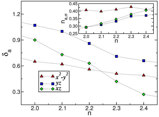 With these caveats, Figure 5 displays the renormalized orbital splitting (; main panel) and the occupation numbers (; inset) predicted using DFT+DMFT for pure and electron-doped . Notice that the orbital polarization is diminished with increasing n, resulting in significant changes in the orbital occupations, as illustrated in the inset of Figure 5. This response to correlated compounds is common; electron band filling is untied to orbital and charge fluctuations in the correlated one-particle electronic state. Moreover, as unveiled in Figure 5, notable modifications in are observed with increasing n. As can be seen, up to , the orbital represents the ground-state (or lowest-energy) orbital, with the orbital occupying this position above total band filling. Here, the gravity center of the orbital is enhanced towards the higher-energy orbital sector. It is noteworthy that the doping-induced twofold () orbital degeneracy observed in the main panel of Figure 5 may have implications for the unconventional superconductivity observed in systems. A review of previous studies on Fe-based superconducting materials indicates that they exhibit orbital degeneracy due to their tetragonal crystal symmetry. Therefore, our theory suggests that Cooper pair formation in doped primarily involves the orbitals. In accordance with our hypothesis, can be conceptualized as a two- electronic fluid, with one taking part in the superconducting state and the other not. Our proposal may be applicable to systems in a bad-metal regime near to twofold orbital degeneracy, wherein part of the normal spectral weight contributes to the superconducting condensate below . In light of these findings, there are promising avenues for two-fluid theories of superconductivity [79] in .