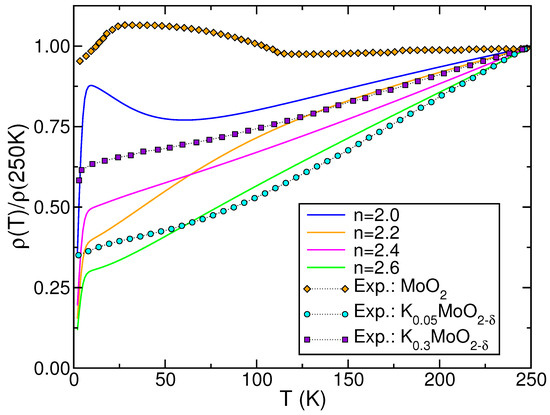 The unusual metallicity evident in pure and oxygen-deficient [8,30], as well as in K-doped , [6,7] and its deviation from the FL dependence of the resistivity in the normal state, lends further support for orbital selectivity in stoichiometric and electron-doped . In particular, here, we describe the T dependence of the resistivity, correlating it with the selective orbital scenario derived above. Given the DMFT spectral functions () the (static) conductivity [80] can be written as . In this expression, is the bare DFT DOS of the a orbitals (Figure 1), is the unit cell volume, and is the Fermi function. As in Refs. [81,82,83], the aim of the approximation made here is to disregard the dependence of the electron’s velocity (). Thus, for simplicity, is thus approximated using a single carrier velocity (v). This approximation has been considered for the evaluations of of heavy-Fermion and transition-metal systems [81,82,83], thereby corroborating our approximation in as previously stated. The aim here is to demonstrate how this approach provides a qualitative description of the experimental resistivity data on Mo-based oxides.