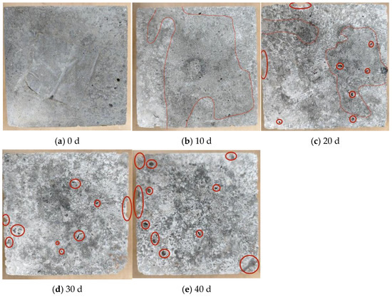 The surface changes at 0 d, 10 d, 20 d, 30 d and 40 d are shown in Figure 1a.