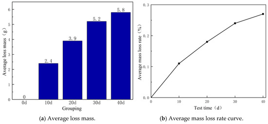 As shown in Figure 2a, with the increase in crystallization time, the average mass loss (Equation (1)) of the sample showed an upward trend, indicating that the precipitation of calcium ions produced by the cement hydration of concrete samples increased. As shown in Figure 2b, with the increase in test days, the mass of the sample continued to decrease, and the average mass loss rate of the sample gradually increased, but the increase rate of the average mass loss rate gradually slowed down. This shows that the mass loss in the same time period (every 10 days) gradually decreased with the passage of time.