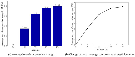 As shown in Figure 3a, with the increase in crystallization time, the average loss of compressive strength of the sample showed an upward trend. This shows that when calcium carbonate crystals are continuously precipitated from the tunnel initial support concrete, its compressive strength decreases. As shown in Figure 3b, with the increase in test days, the compressive strength of the sample continued to decline, and its average rate of loss of compressive strength continued to rise. However, the rising rate of loss rate gradually slowed down.