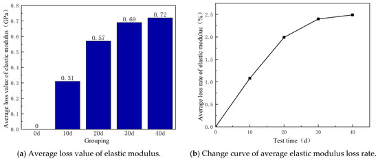 As shown in Figure 4a, with the increase in crystallization time, the average loss value of the elastic modulus of the sample showed an upward trend. The results show that the continuous precipitation of calcium carbonate crystals in the tunnel initial support concrete will lead to a decrease of its elastic modulus, which will lead to a decrease in concrete stiffness. As shown in Figure 4b, with the increase in test days, the elastic modulus of the sample continues to decline, while its average elastic modulus loss rate continues to rise, but the rising speed gradually slows down.