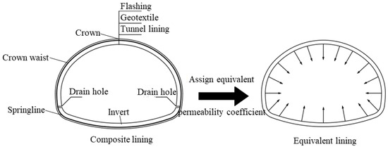 The tunnel was intended to feature composite lining, which is a common form of tunnel engineering at present. During the construction of the composite lining, a waterproof layer will be set between the primary support and secondary lining of the tunnel. The waterproof layer is mainly composed of a circumferential drainage pipe, geotextiles and a waterproof board. At the same time, the composite lining will feature drainage holes at the bottom of the lining side wall, so its drainage structure is more complex. Due to the isolating effects of the geotextile and waterproof board on the water outside the lining, the secondary lining itself has a strong waterproof capacity, and its water permeability is generally not considered in the calculation. It is considered that the secondary lining is an impermeable material, and the permeability coefficient is taken as 0. However, due to the existence of the tunnel drainage system, the drainage pipe set in the secondary lining will guide the water flow in the circumferential drainage pipe to discharge through the drainage ditch; this means that the secondary lining is a permeable structure from a macro perspective, so the drainage capacity can be shown by giving a permeability coefficient to the secondary lining in order to simplify the calculation, as shown in Figure 5.