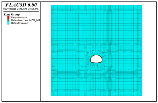 The fluid structure coupling model of FLAC3D 6.0 software is used for this calculation, and the solid element is used to model each part. The model is 120 m long, 120 m high and 1 m thick. The buried depth of the tunnel is 60 m, wherein the thickness of the initial support is 15 cm and the thickness of the secondary lining is 50 cm, as shown in Figure 6. The initial in situ stress field of the rock and soil mass takes into account the self-weight stress, and the pore water pressure is hydrostatic pressure. The initial support and secondary lining of the tunnel are simulated as a solid element, and the surrounding rock of the tunnel is modeled by use of the Mohr Coulomb elastic–plastic model. Among the material parameters used in the numerical calculation, the initial support parameters after crystallization are calculated according to the data of indoor test crystallization time of 20 d and 40 d, and according to Equations (4)–(6). At the same time, the drainage capacity of the tunnel is considered in the calculation. References [31,32] give an equivalent permeability coefficient to the lining, and reduce it according to the degree of blockage. The selection of the remaining material parameters is based on the relevant specifications for highway tunnel design. The detailed material parameters and calculation conditions are shown in Table 3 and Table 4.